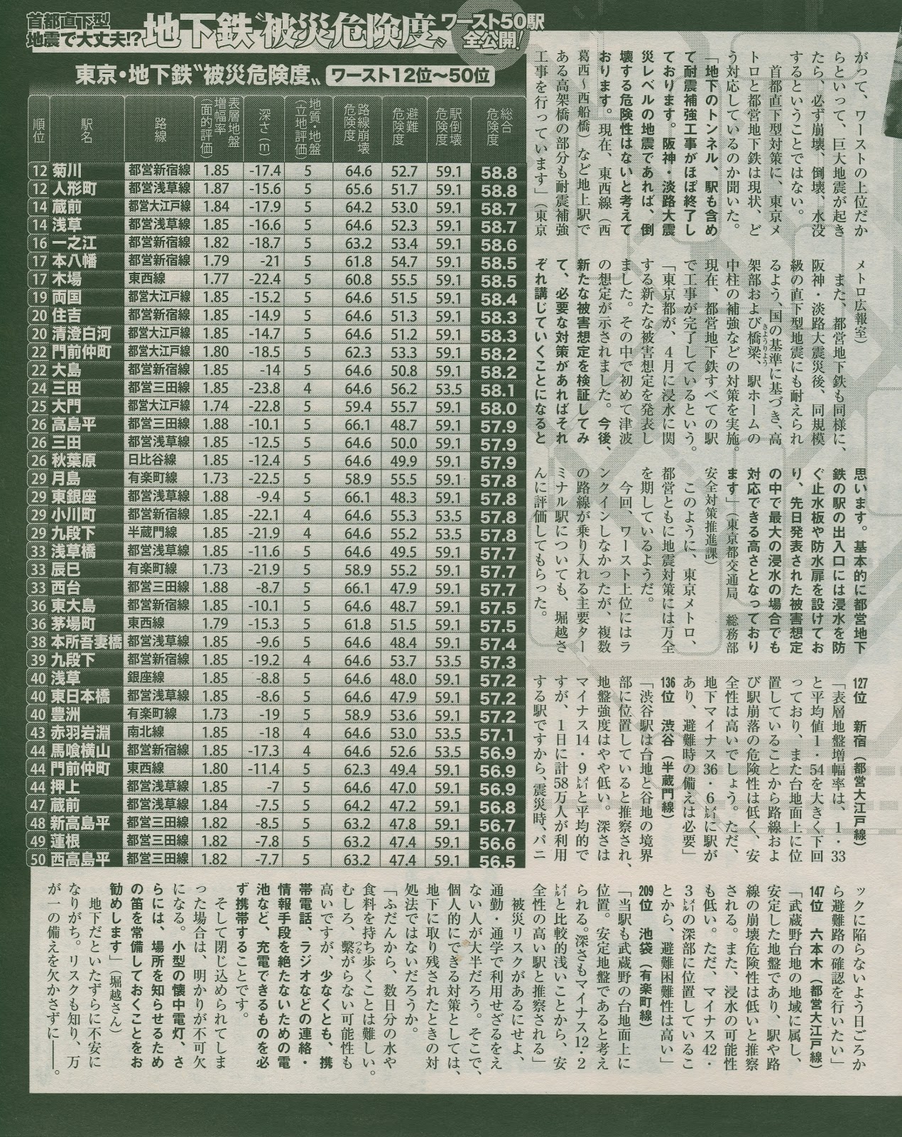 The most dangerous subway stations in Tokyo! It’s kind of like old East Germany and West Germany… I mean, how it sizes up for Tokyo subway stations; the stations on the “old” east side of Tokyo are death traps! The higher the score (#1 Sumiyoshi) has a score of 61.6…. What does that mean? Hell, if I know… But 61.6 spells, “Death trap!” “Game Over!” “Dead as a Doorknob!” “Fin!” “Owari!”